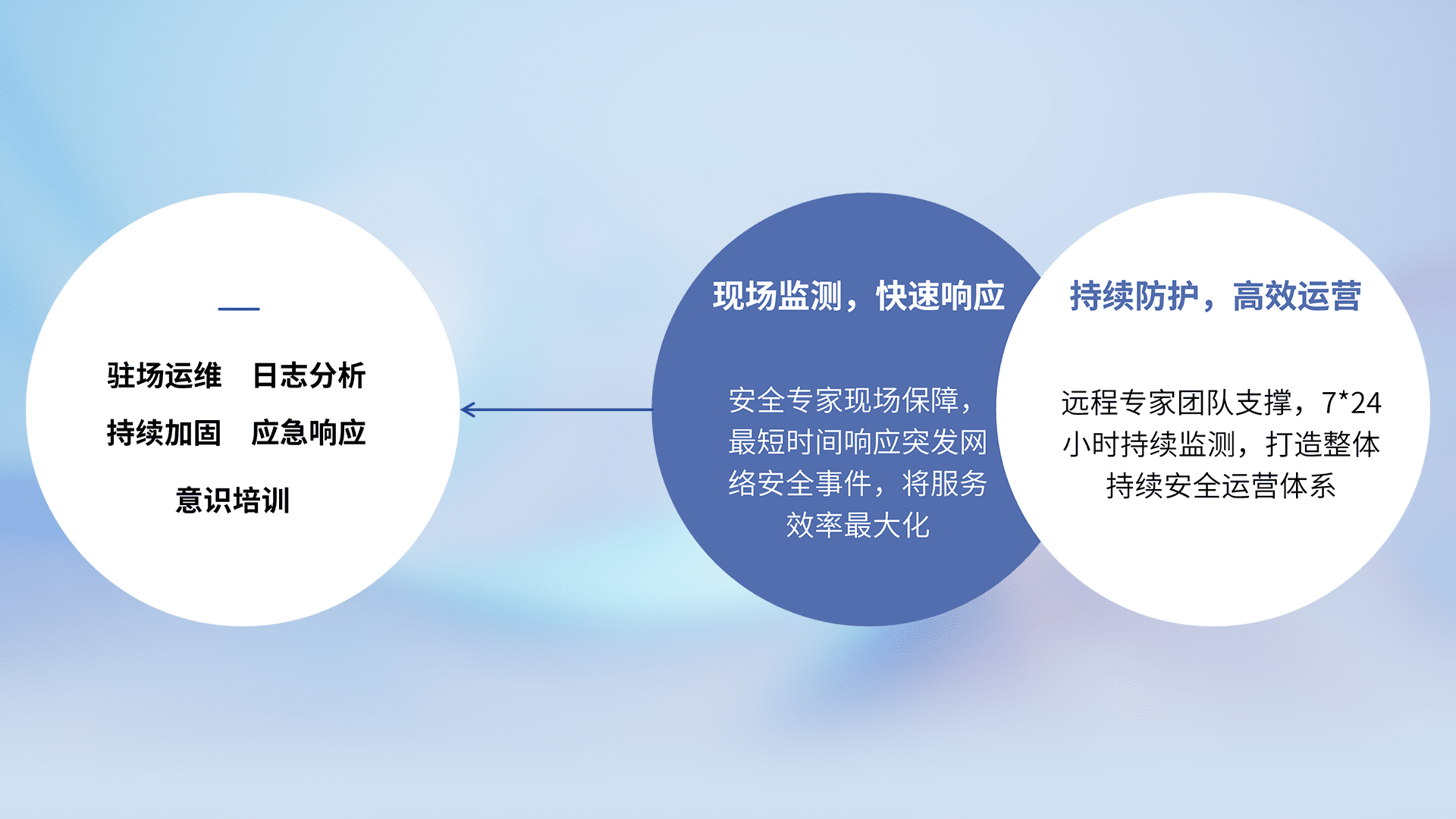 7X24小时持续监测安全事件,保持安全策略有效性,降低资产脆弱性风险,,精准拦截黑客攻击,,减少被黑客利用的机会,,,第一时间遏制,,,降低损失。。